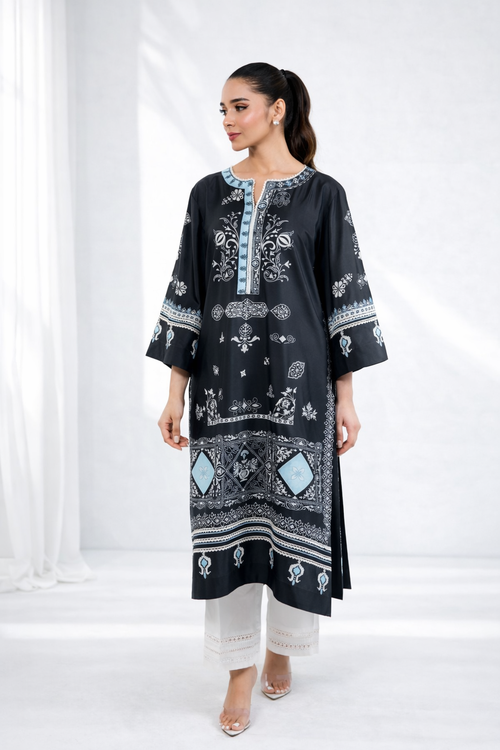 Cool, contemporary, and effortlessly stylish, this denim-grey digitally printed two-piece