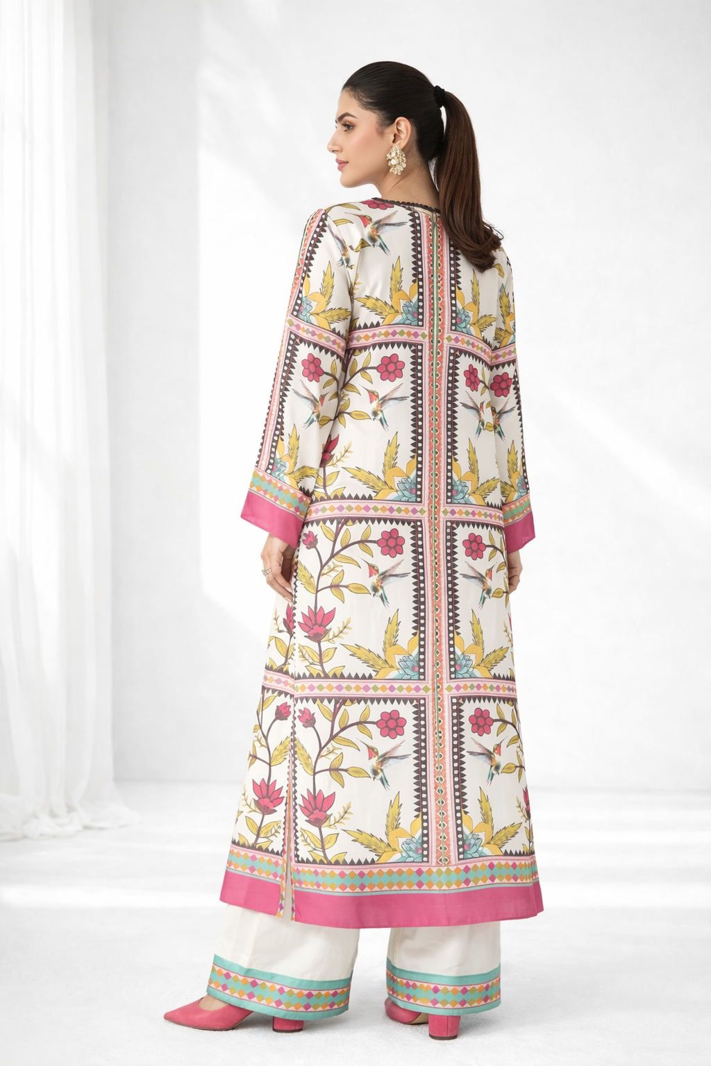 ivory base is brought to life with lively floral and geometric motifs in pink, green, and